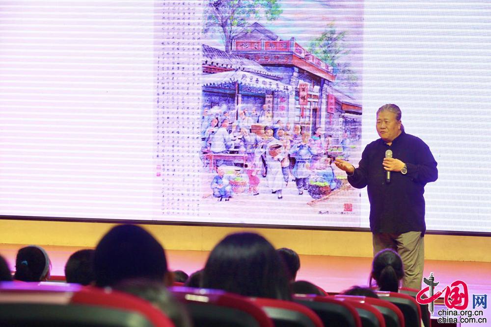 图为京味画家杨信讲解自己绘制的画作《王致和非遗故事》