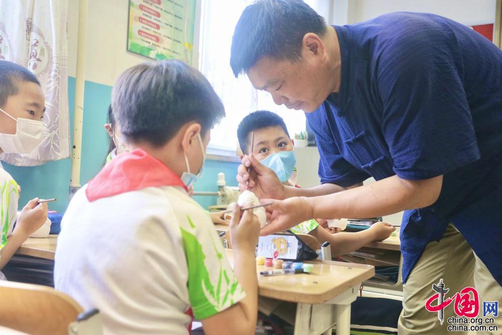图为北京泥彩塑第五代传承人张忠强教孩子们绘兔儿爷。