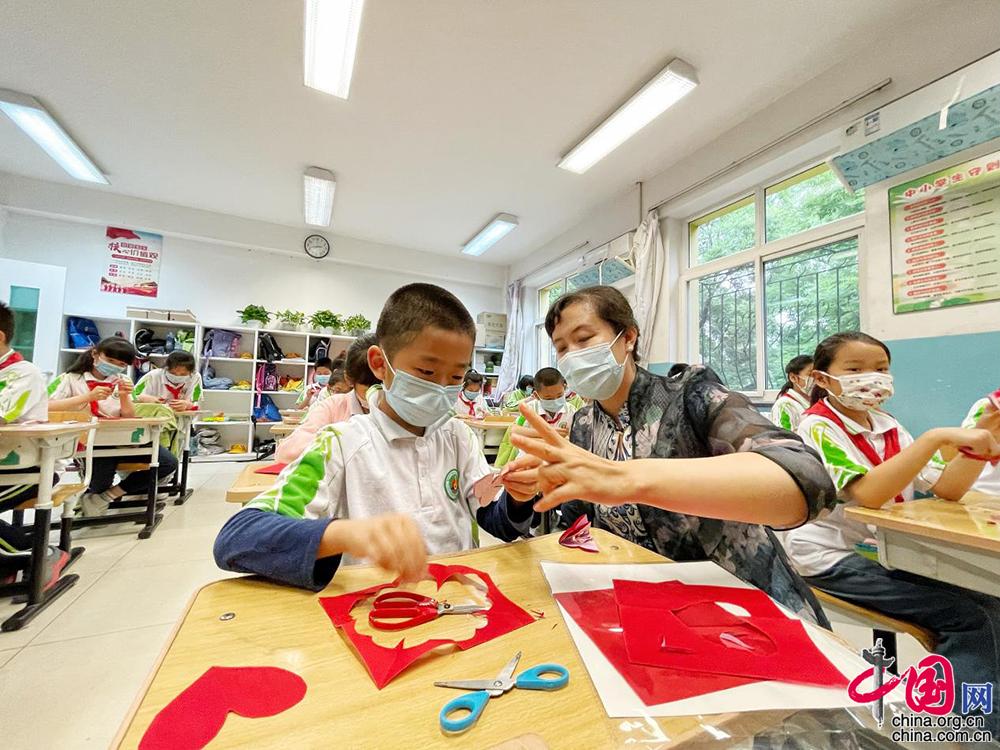 图为国家级非遗剪纸项目传承人刘晓迪带领孩子们剪出各种美丽的图案