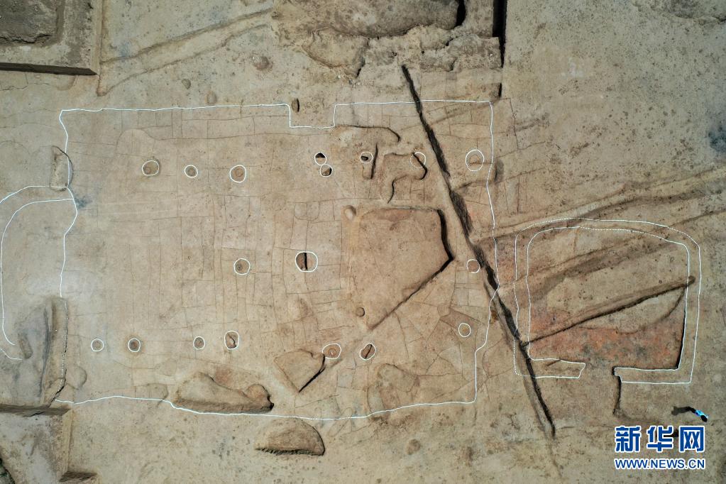 陶寺遗址宫城内大型夯土建筑基址上的宫室类单体建筑遗迹(6月3日摄,无人机照片)。