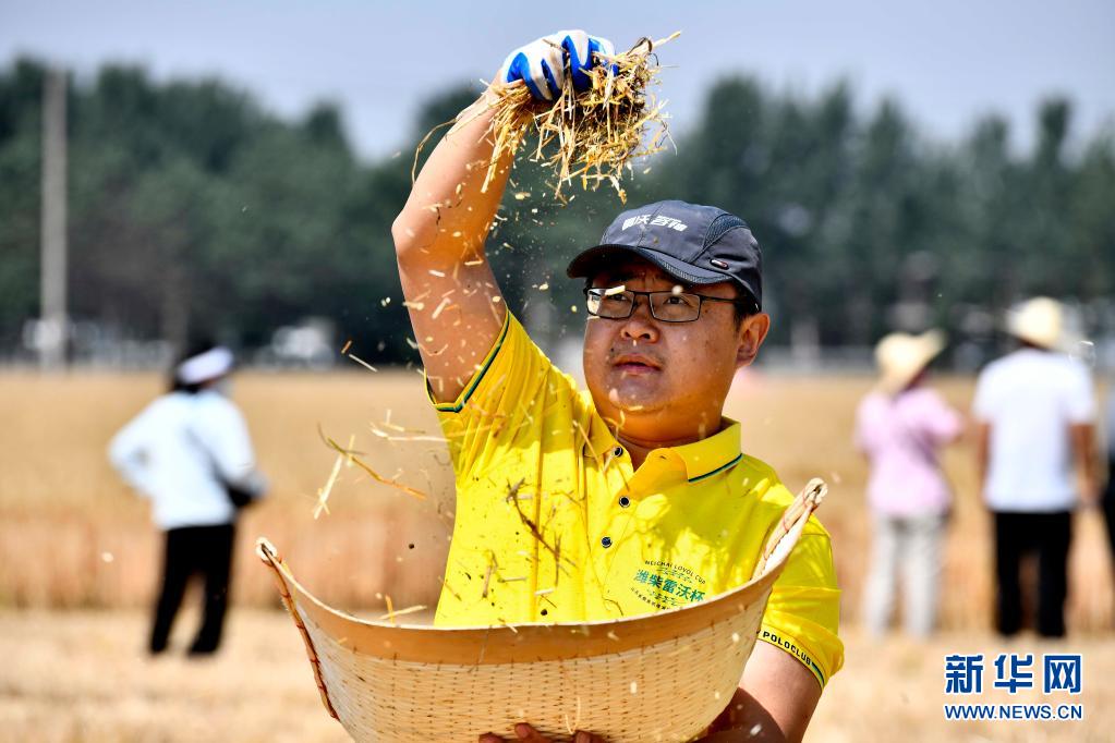 6月4日,在滕州市官桥镇,工作人员扬去杂质提取麦粒,测算减损率。