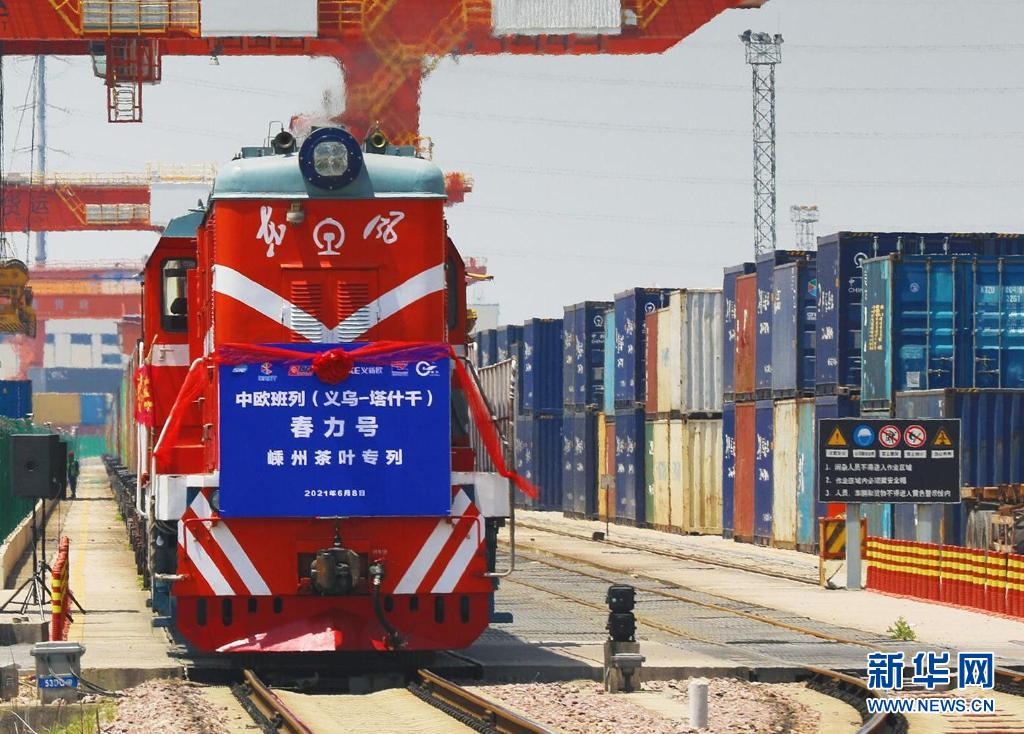 6月8日,满载茶叶及茶产品的中欧班列从义乌西站启程。