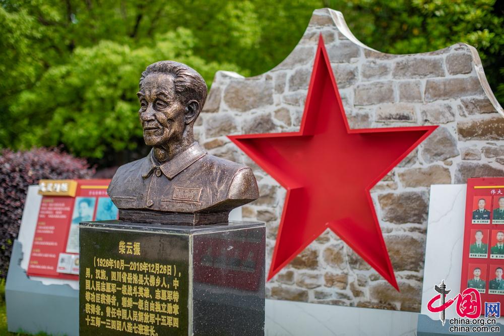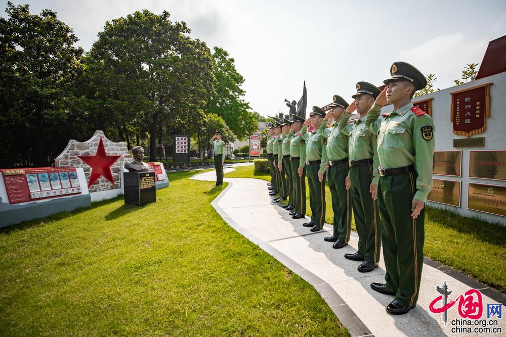武警湖北省总队执勤支队执勤二大队执勤九中队是一支具有光荣历史的红色连队。1931年创建于鄂豫皖苏区红安县,是徐向前元帅领导下,由参加黄麻起义的农民赤卫队为骨干组建起来的连队。先后参加过红军长征、抗日战争、解放战争、抗美援朝战争,历经重大战斗150余次。图为中队“柴云振”班全体战士向战斗英雄塑像敬礼。中国网记者 郑亮摄