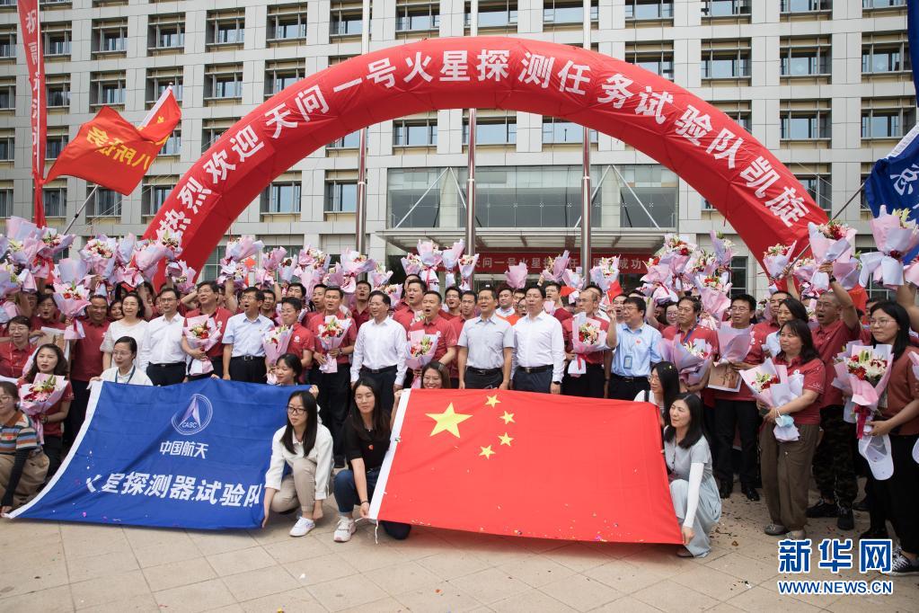 当日,天问一号火星探测器抓总研制单位——航天科技集团五院在航天城玉琮广场举行欢迎活动,迎接天问一号火星探测任务试验队凯旋。