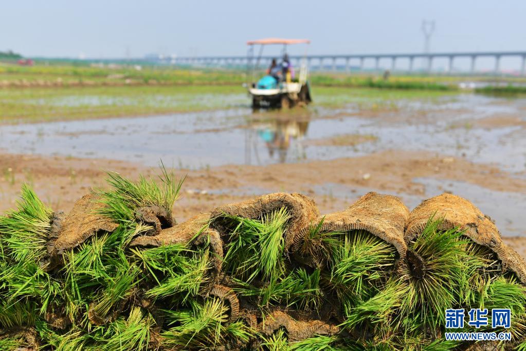 6月11日,农民在青岛市城阳区上马街道的盐碱地稻作改良示范基地驾驶插秧机进行插秧作业。