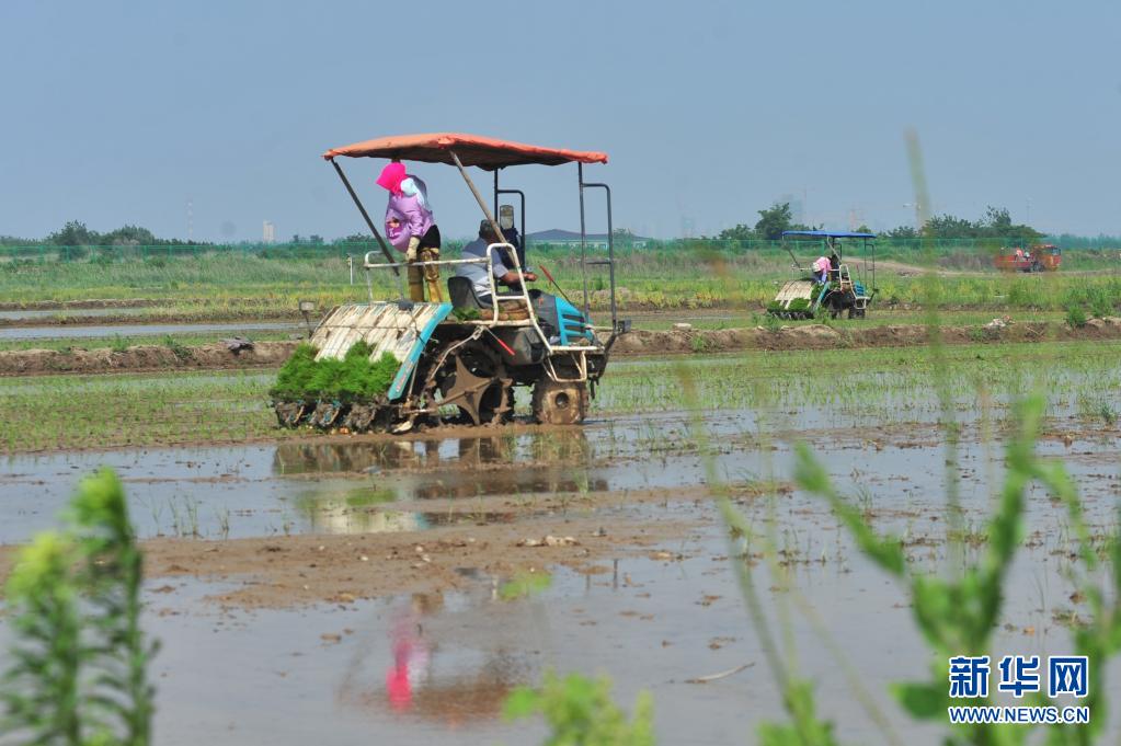 6月11日,农民在青岛市城阳区上马街道的盐碱地稻作改良示范基地驾驶插秧机进行插秧作业。