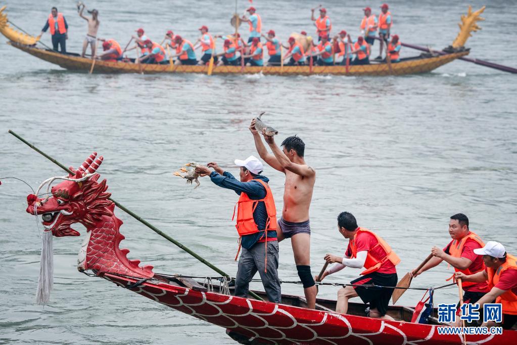 6月12日,参赛龙舟队在汉江上表演抓鲤鱼和活鸭。新华社记者 陶明 摄
