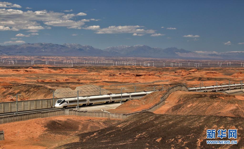 6月18日,CRH5E型长编卧铺动车组列车行驶在兰新高铁上。