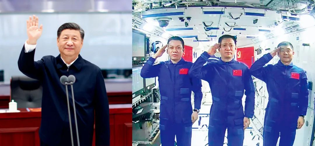 6月23日,北京航天飞行控制中心,中共中央总书记、国家主席、中央军委主席习近平同在天和核心舱执行任务的神舟十二号航天员通话。图/新华