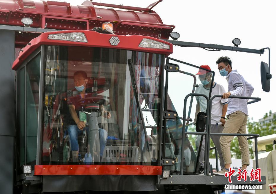 7月11日,2021新疆农业机械博览会(新疆农机展)在位于乌鲁木齐市红光山的新疆国际会展中心开幕。新疆作为中国重要的棉花主产区之一,多家企业携最新款采棉机前来参展,棉花全程机械化展区成为本届农机展竞争最为激烈的擂台区。图为棉花全程机械化展区,参观者登上采棉机,详细了解产品性能。 中新社记者 刘新 摄
