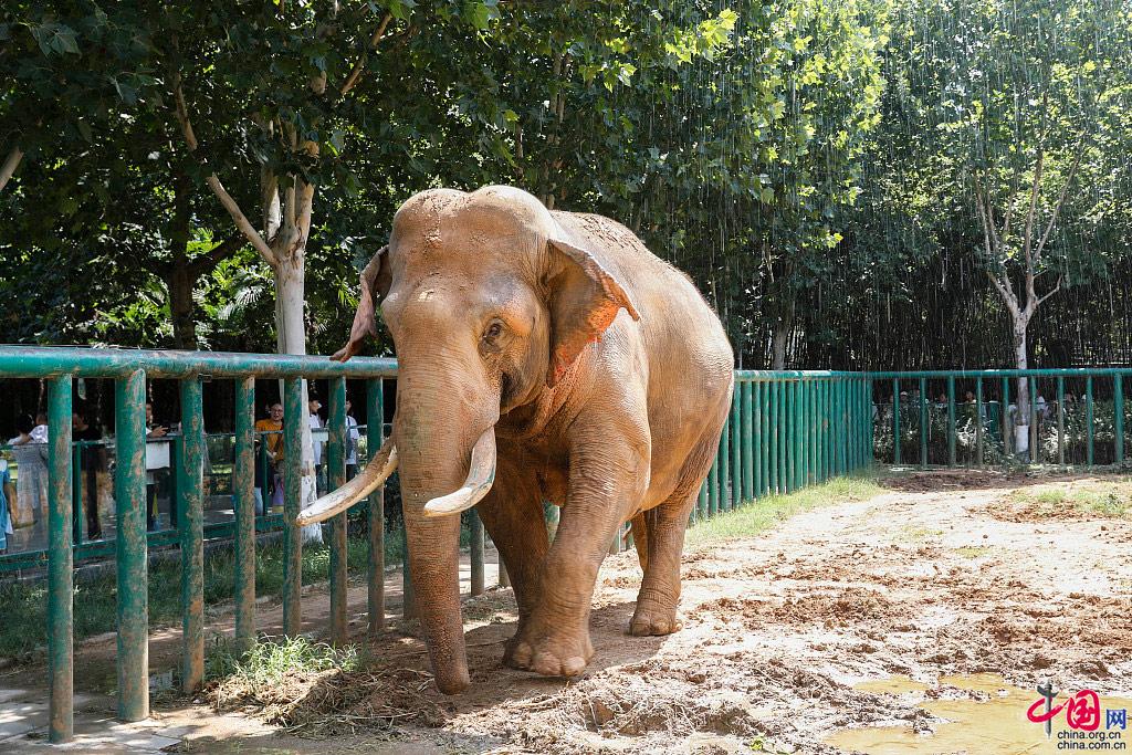 连日高温天气,郑州市动物园通过设置人工喷淋、增设空调、为动物提供冰块和水果等多种方式,帮助动物们消暑降温,清凉度夏。图为7月13日,郑州市动物园的大象享受喷淋。图片来源:何五昌/视觉中国