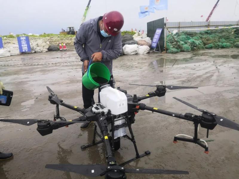 工作人员正向安在无人机的容器倒浒苔快速腐熟复合菌剂。摄影/ 周群峰