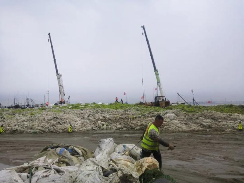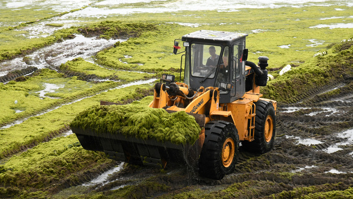 浒苔经过喷洒快速腐熟复合菌剂后被投海做无害化处理。摄影/ 周群峰