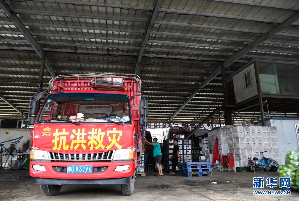 7月22日,抗洪救灾车辆在河南万邦国际农产品物流城装运蔬菜。