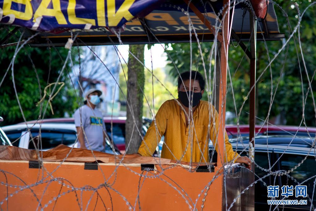 7月23日,在马来西亚吉隆坡一个实行“加强行动管制令”的社区,一名居民隔着铁丝网向外张望。