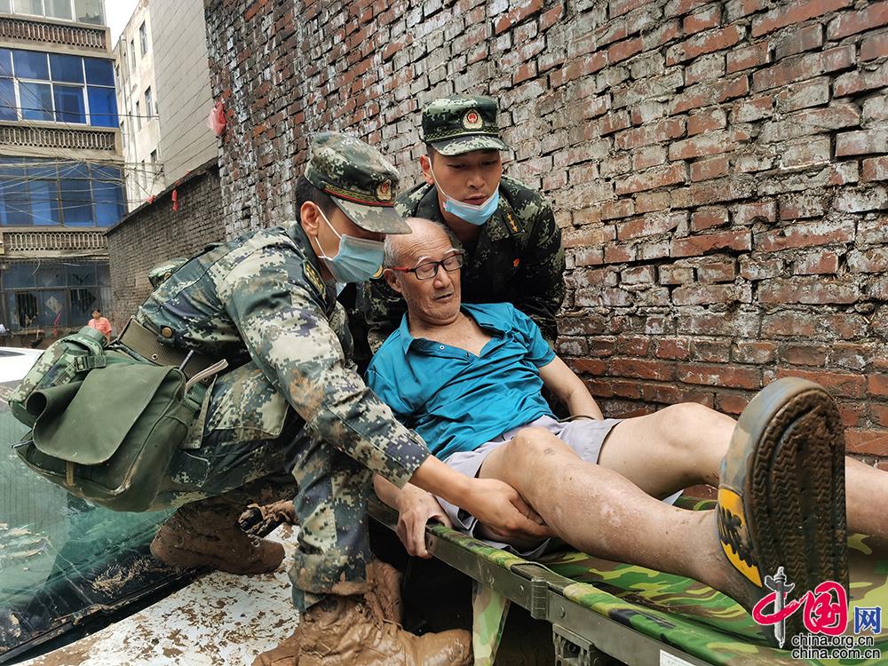 中国网7月24日讯 你们在就是希望。7.24日,米河镇主干道基本清理完毕后,武警第一机动总队某支队逐步展开对巷道、街区清理工作。图为该部官兵从小区内转移一名腿脚不便老人,前往送医。家属感谢道:“你们在就是希望”。李恒 江泽红摄影