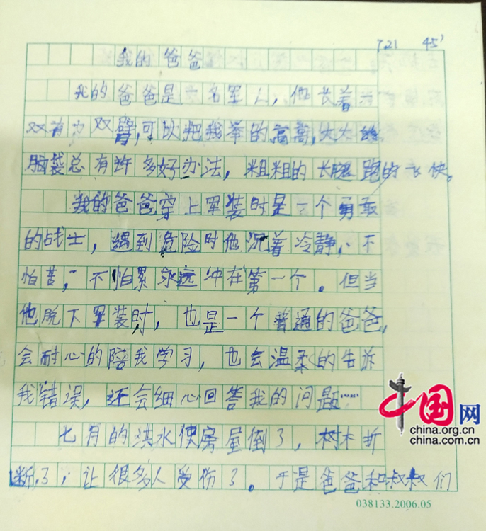 中国网讯 7月23日,在巩义市米河镇抗洪抢险救援的战场上,武警第一机动总队某支队教导员叶洪胜收到妻子发来儿子写的一封信。这封信满是儿子对父亲的担忧与牵挂,让人看后不禁动容。