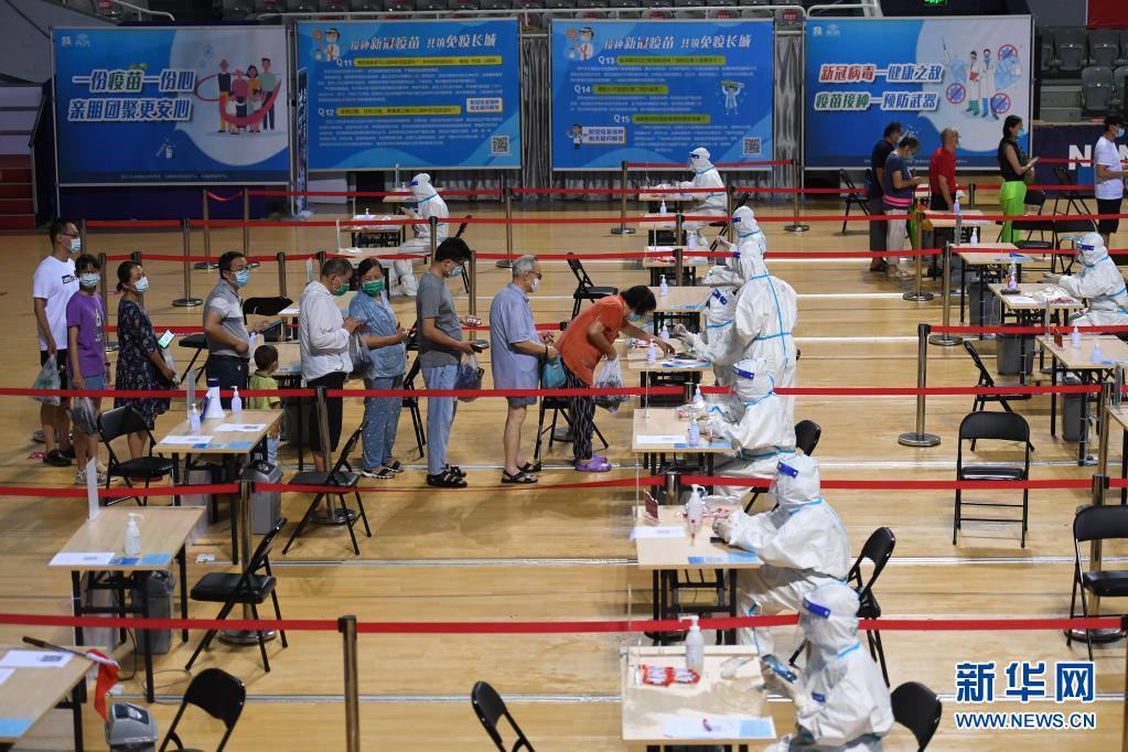 7月25日,市民在南京市鼓楼区五台山体育中心体育馆内登记信息,准备接受核酸检测取样。