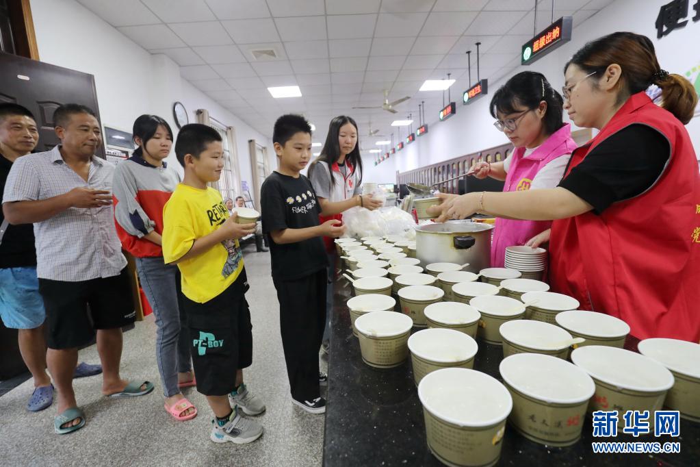 7月25日,在浙江省湖州市德清县舞阳街道上柏村临时安置点,志愿者为安置转移人员送上早餐。