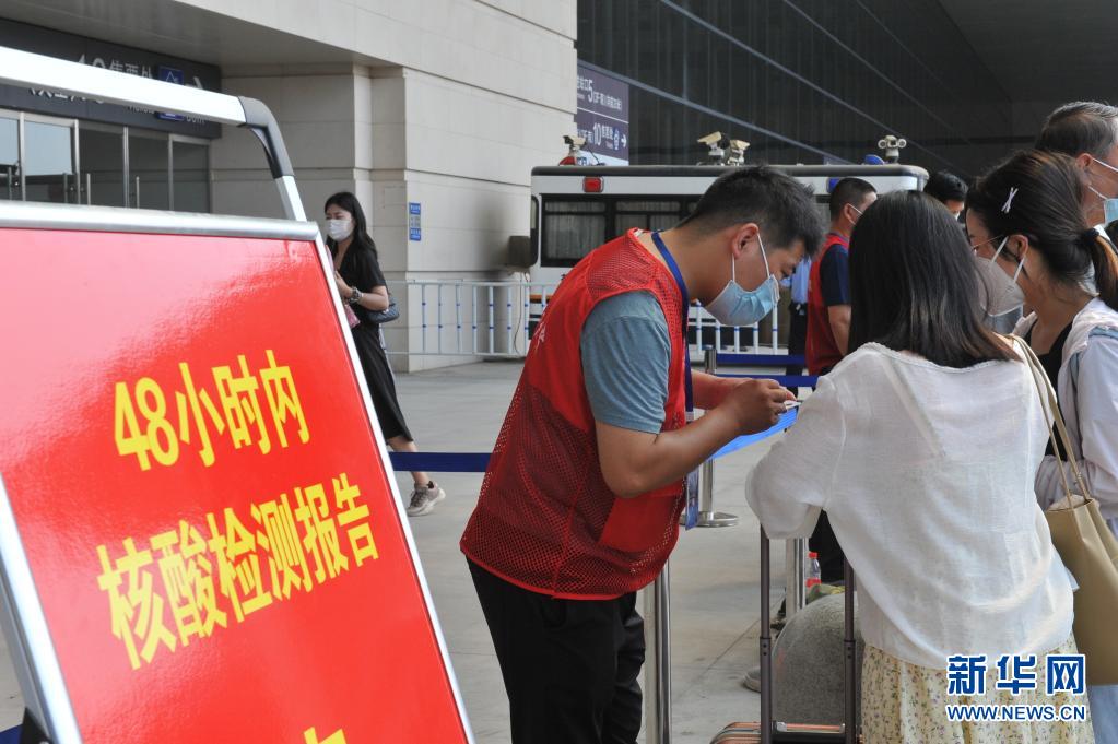 8月1日,在郑州东站南进站口,工作人员查看旅客的核酸检测证明。