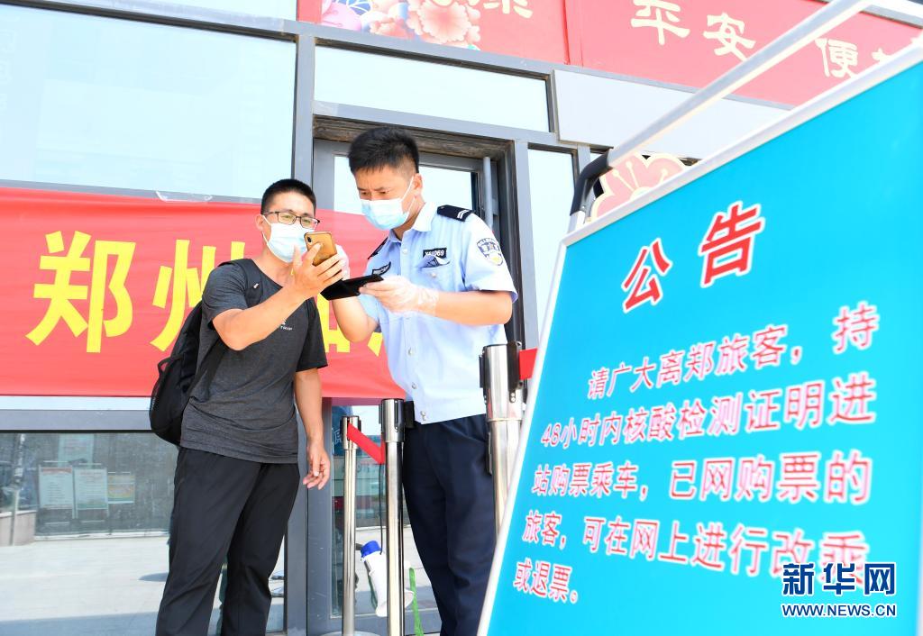 8月1日,在郑州长途汽车客运东站,工作人员在查看旅客核酸检测报告。