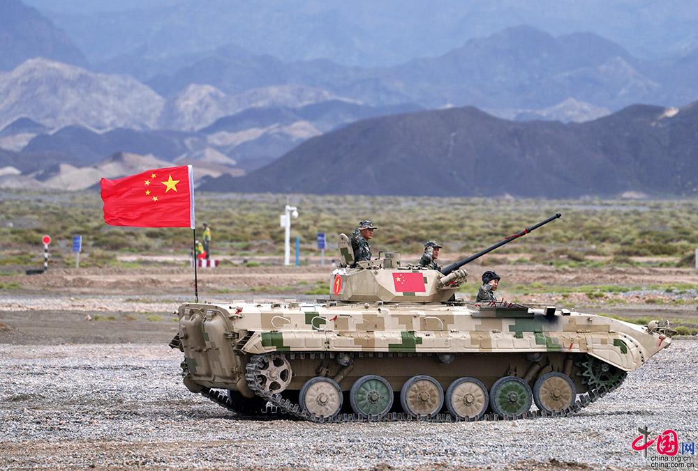 8月30日,“国际军事比赛—2021“中国库尔勒赛区”苏沃洛夫突击“项目举行最后一次单车赛,中国参赛队驾驶步战车通过烟火路段。中国网发 罗兴仓 摄