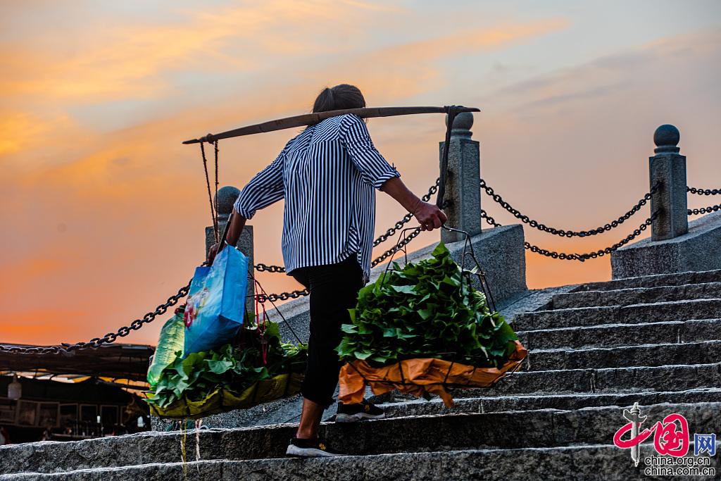 2021年9月3日,江西赣州,东河浮桥的清晨,朝阳绚烂多彩,来来往往的行人与摆放整齐的渔船构成了一幅动人的人文风景画。图片作者:黄杨军/视觉中国