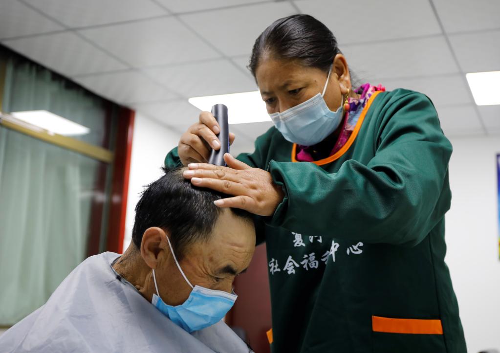 9月3日,在甘肃甘南夏河县拉卜楞综合社会福利中心,护理人员给老人理发。新华社记者 冯亚松 摄
