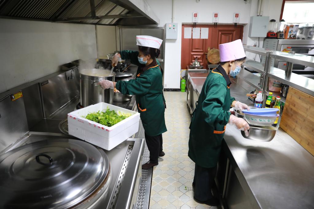 9月3日,在甘肃甘南夏河县拉卜楞综合社会福利中心,工作人员在准备午餐。新华社记者 文静 摄