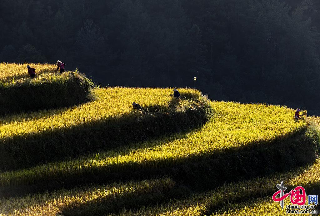 2021年9月22日,湖北宜昌,秭归县沙镇溪镇长春村村民正在田间收获高山冷水稻。图片作者:签约供稿人/视觉中国