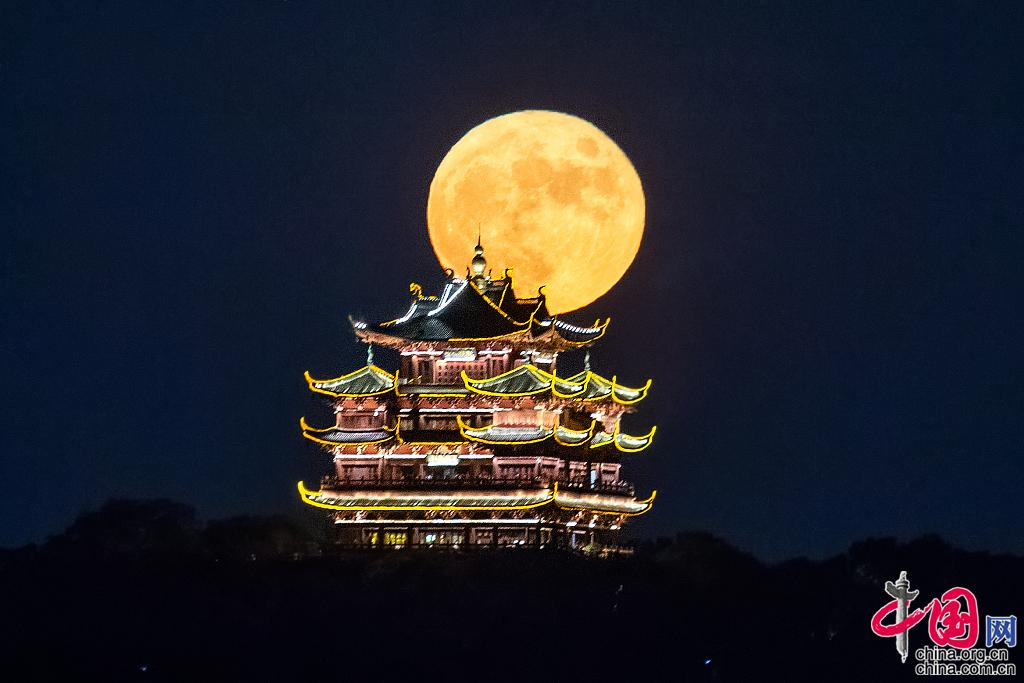 2021年9月21日中秋节,杭州,圆月从西湖上空缓缓升起,与城隍阁交相辉映。图片作者:签约供稿人/视觉中国