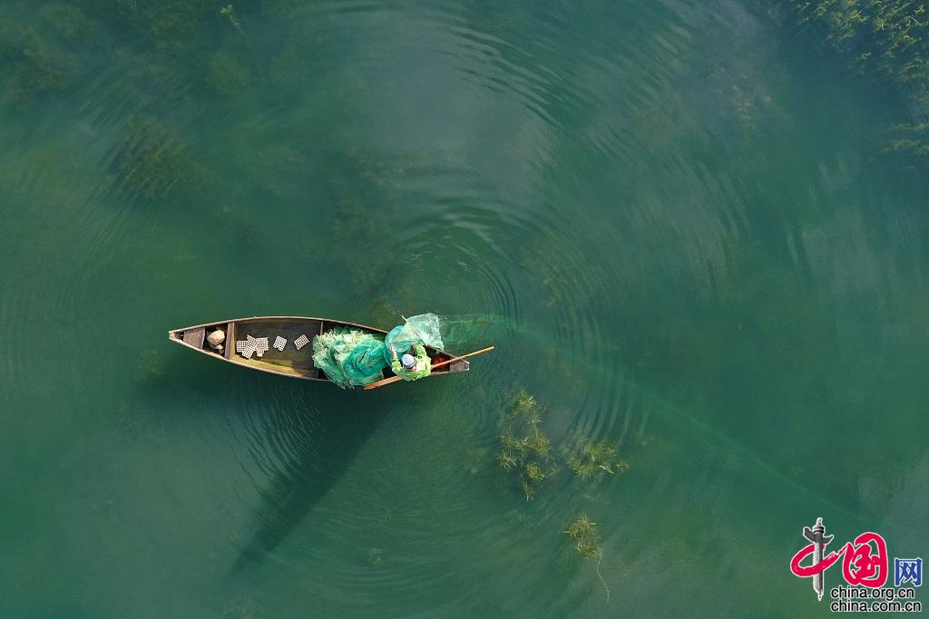 2021年9月21日,昆明,石林月湖,航拍渔民泛舟捕鱼。图片作者:王正鹏/视觉中国