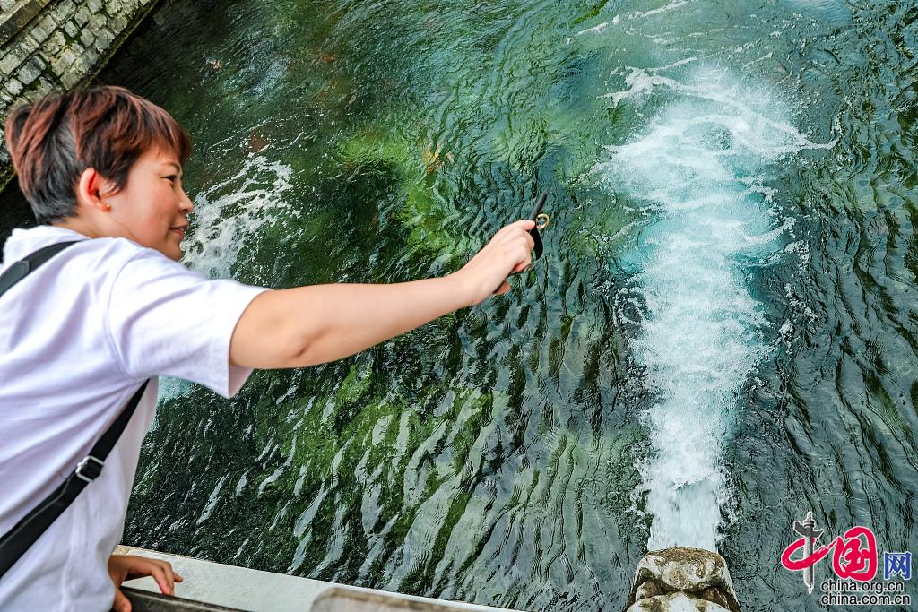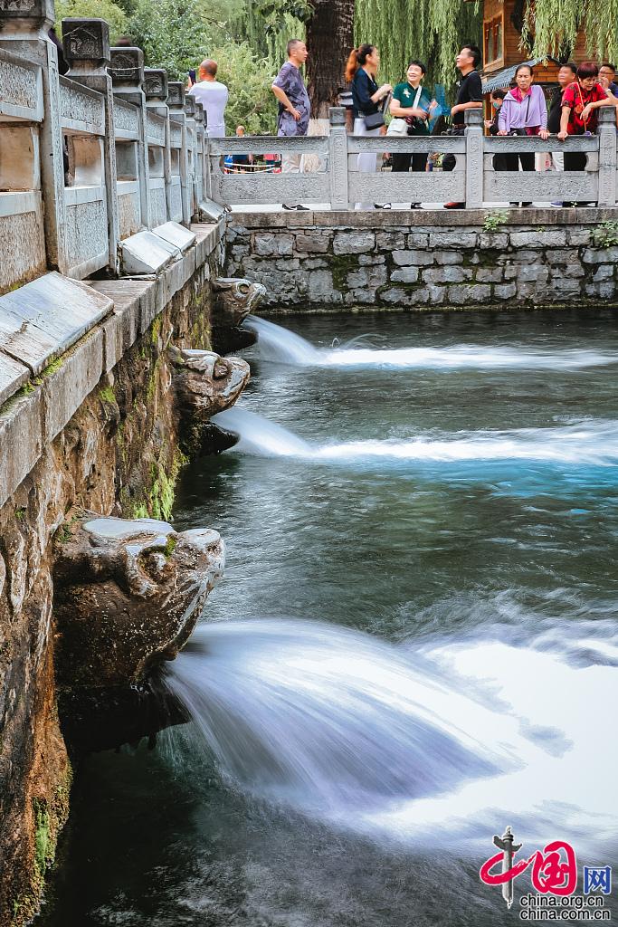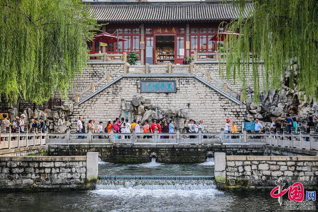 2021年9月23日,受近期雨水助力,济南黑虎泉水位连日攀升,当天上升至29.42米,创今年水位新高,比去年同期的28.10米,高出1.32米。三只兽头“虎”啸震天,发出激昂澎湃的水声,如此胜景吸引众多游人前来一睹泉水美景。图片来源:视觉中国