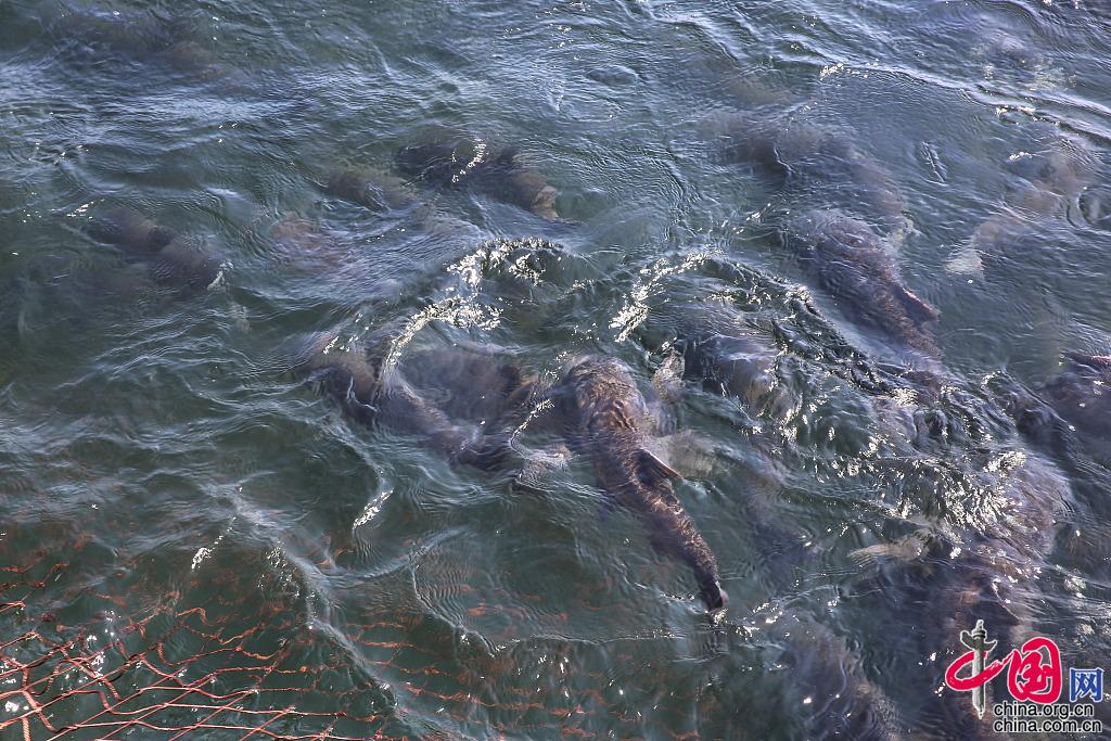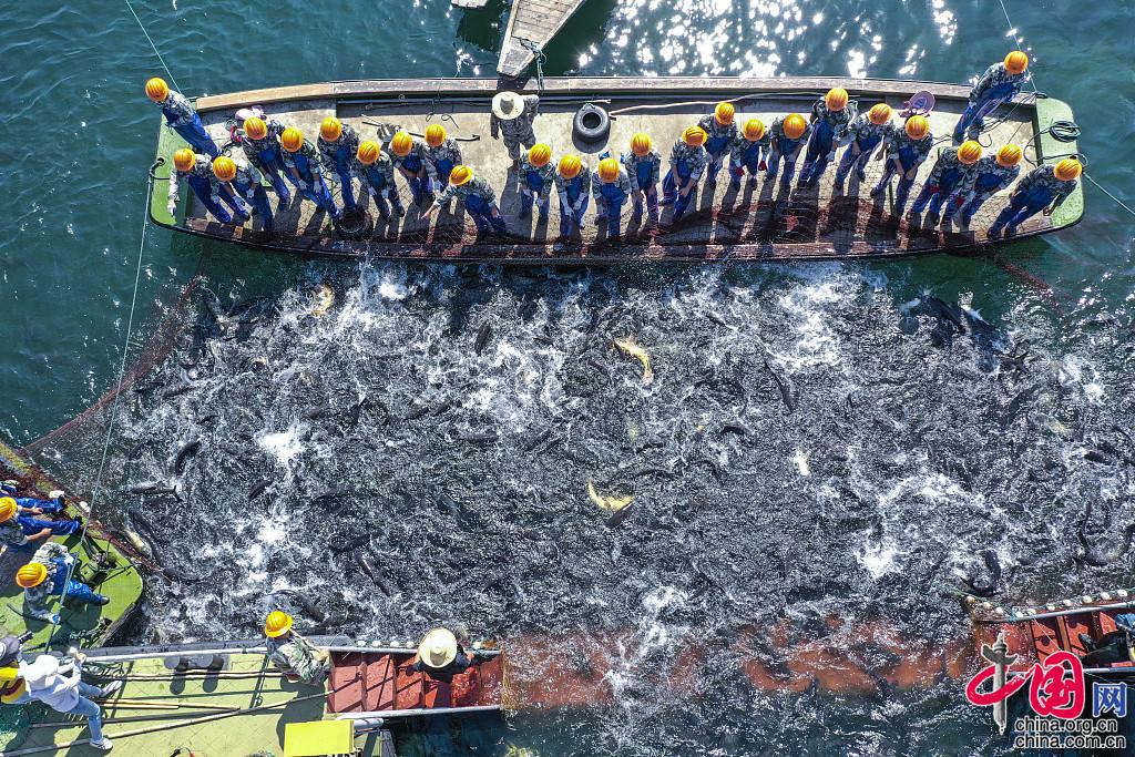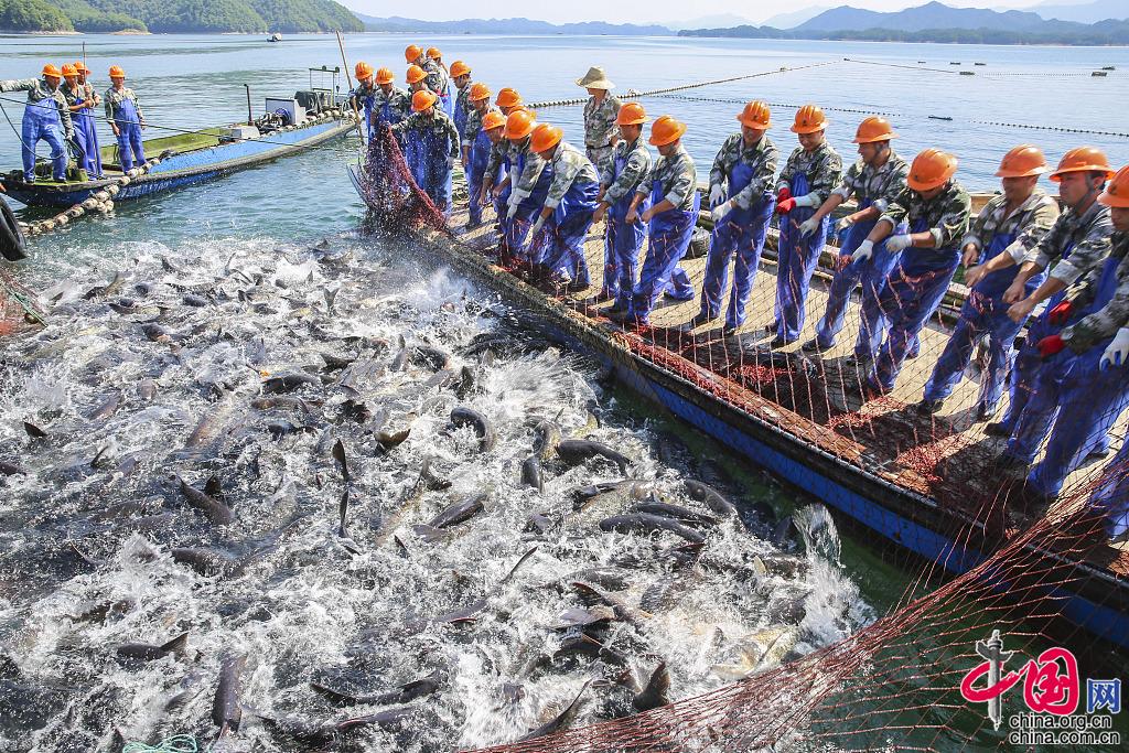 2021年9月23日,杭州,千岛湖有机鱼收获秋分第一网,捕起12万斤鲢鳙鱼,喜迎第四个中国农民丰收节。图片作者:王建才/视觉中国