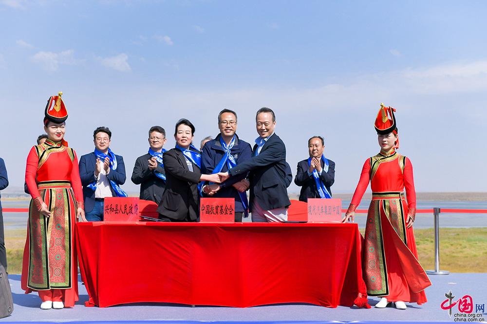 启动仪式上,在各位领导的见证下,中国扶贫基金会、兴和县人民政府和现代汽车集团共同签订了项目三方捐赠协议书,中国扶贫基金会副理事长陈志刚,乌兰察布乌兰察布市委常委、政府副市长李勇,兴和县领导以及现代汽车(中国)投资有限公司副总裁李赫埈共同为项目揭牌,这标志着百美村宿——兴和县乡村振兴示范项目正式启动。