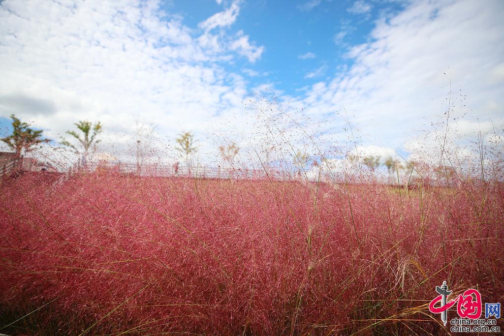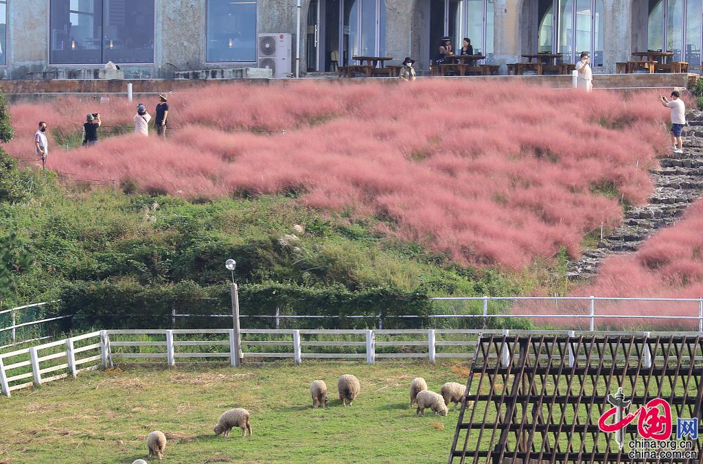 当地时间2021年9月26日,韩国庆尚北道金泉市,当地粉黛乱子草盛开,游客徜徉在粉红花海。图片作者:Yonhap News Agency/视觉中国