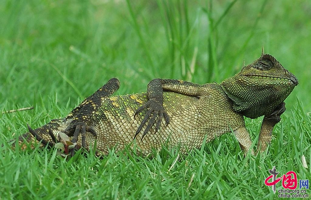 2021年9月27日(具体拍摄时间不详),印尼巴东,一只蜥蜴看起来很放松地在享受日光浴。这只冷血的森林变色龙是在其主人家后院拍摄到的。43岁的摄影师Yan Hidayat两年前发现它在林地中挣扎之后,救助了它。他表示:“我发现它在我家附近的林地中挣扎,它通常生活在室内,但我会带它出去享受阳光。这天它在阳光下呆了两个小时。我很惊讶它能摆出这个姿势,十分的有趣可爱,我捕捉到了这一瞬间。现在它已经完全恢复健康,它从来不会跑远,当饿了需要食物时,会来寻找我。”图片作者:Yan Hidayat/Solent News/视觉中国