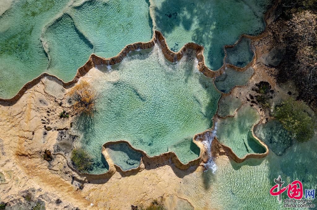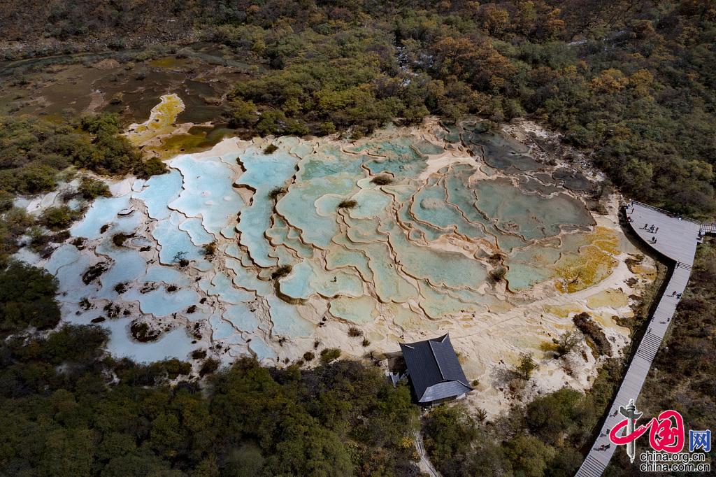 2021年9月28日,四川省阿坝州黄龙风景区秋意渐浓,多彩瑶池美如画,吸引众多游客前来观光。图片作者:刘国兴/视觉中国