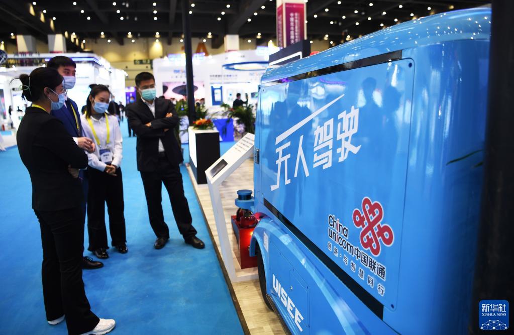 10月10日,观众在北斗融合应用成果博览会上参观一款无人驾驶运输车。