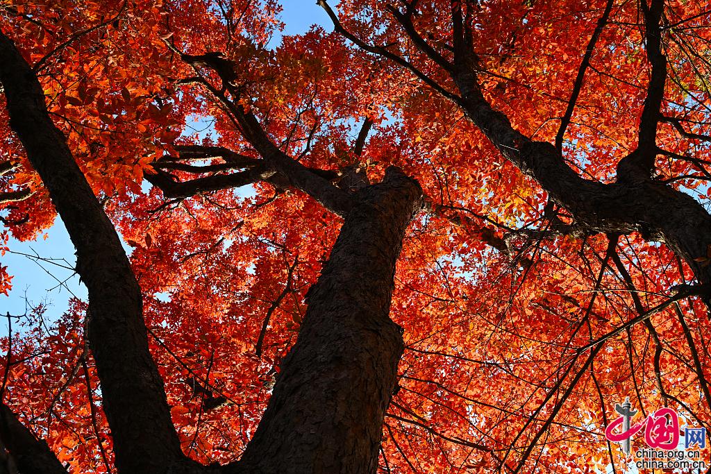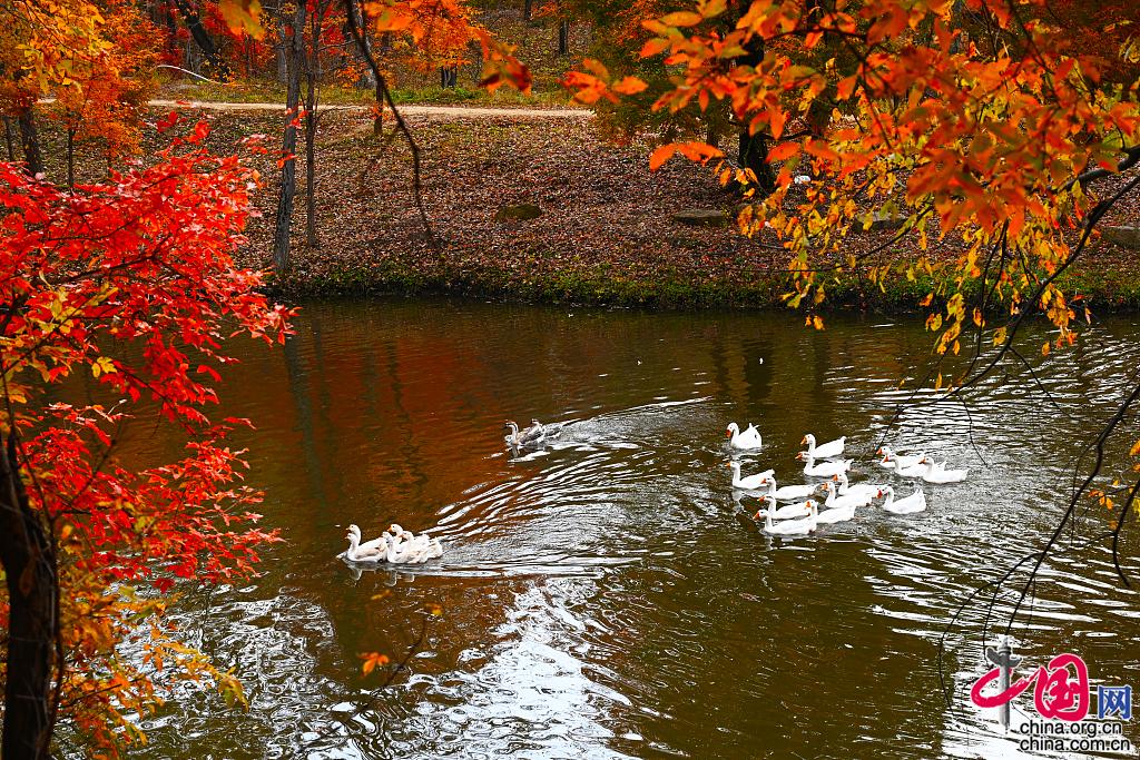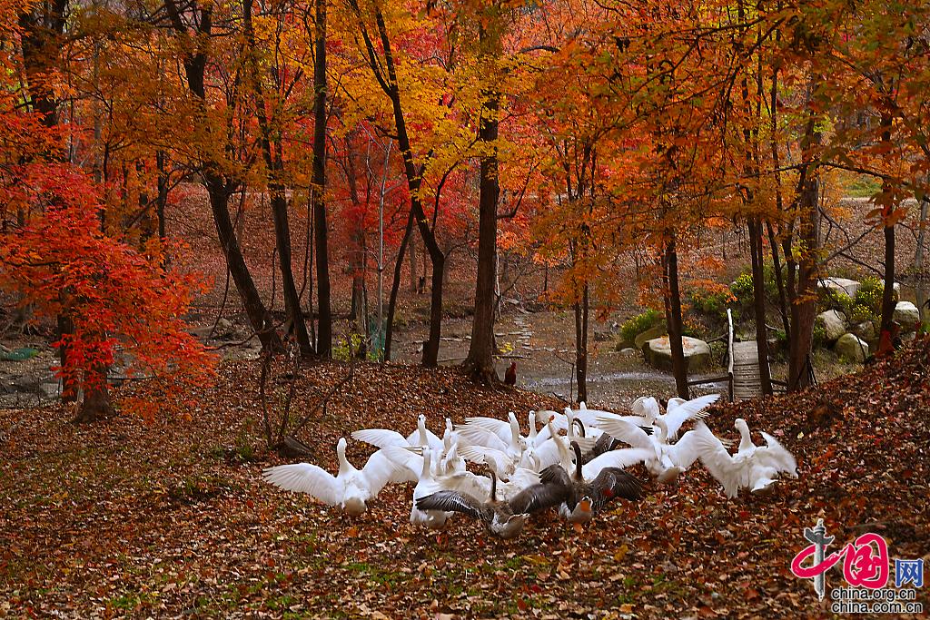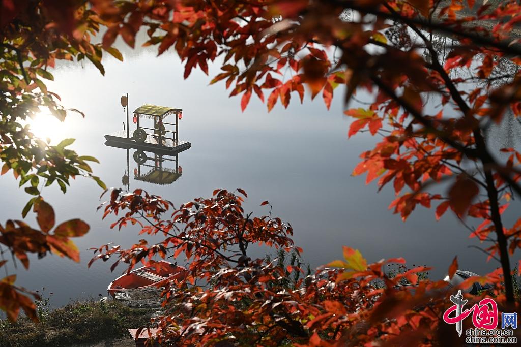 2021年10月9日,吉林省舒兰市开原乡六滴,枫水人家景区,秋叶正红,吸引了很多国内外游客前来观光采风。图片作者:胡小璐/视觉中国
