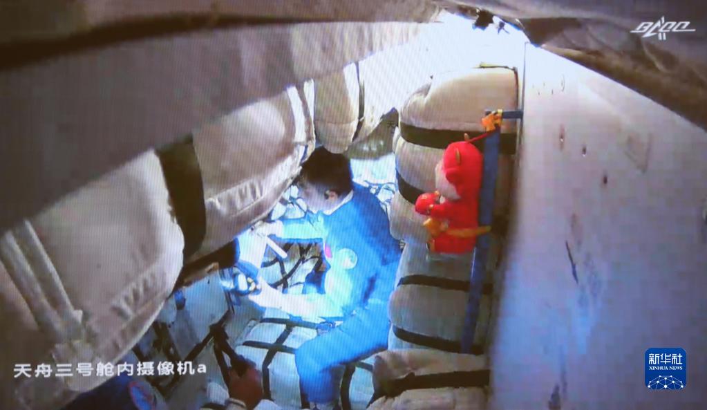10月17日在北京航天飞行控制中心拍摄的神舟十三号航天员乘组进入天舟三号货运飞船的画面。