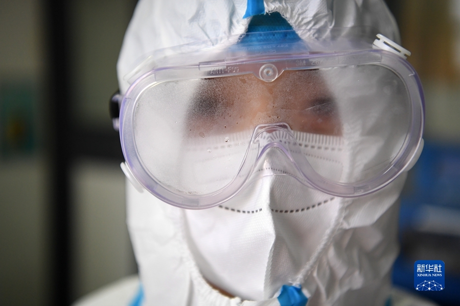 10月21日,兰州大学第二医院检验医学中心检验师彭玲玲的防护镜上沾满了雾气。新华社记者 陈斌 摄
