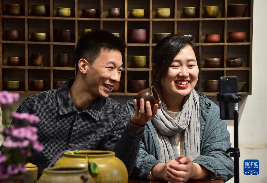 10月22日,吕继成和妻子王春燕通过直播平台推介荣昌陶。新华社记者王全超摄
