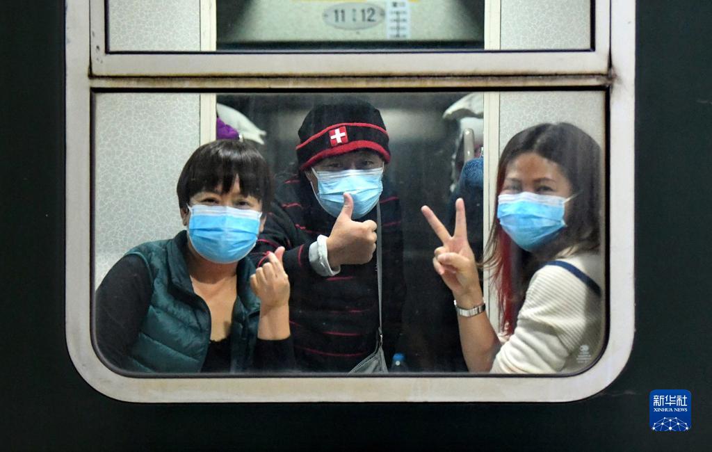 10月29日,滞留游客离开额济纳旗时,在列车车厢里与地面人员告别。