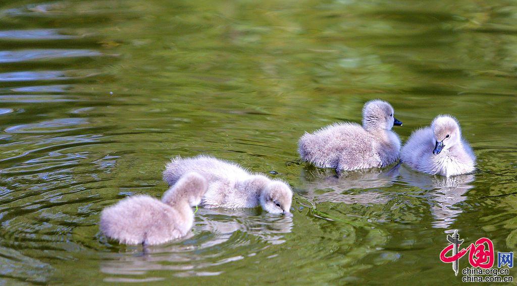 2021年11月3日,河北邯郸鸡泽县天鹅湖黑天鹅夫妇带着出壳第三天的宝宝们在湖里游弋、觅食。图片作者:金华/视觉中国