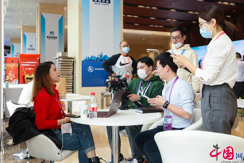 中国外文局外籍记者在进博会新闻中心接受媒体采访。中国网记者 董宁 摄影