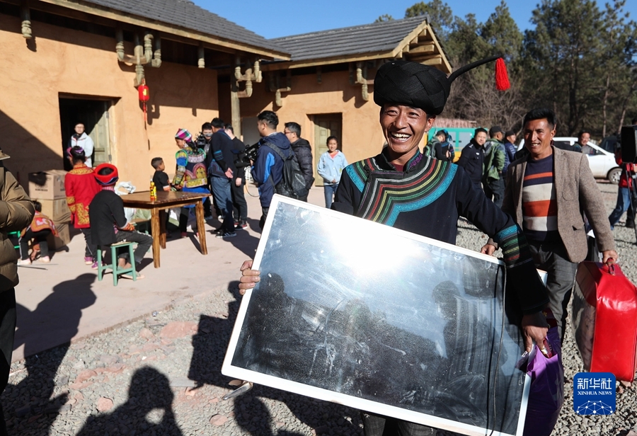 在四川省昭觉县三河村的易地扶贫安置点,彝族群众马海日聪喜搬新居(2019年2月11日摄)。2019年2月11日,位于大凉山腹地的四川省昭觉县三河村首批29户、168人告别居住多年的土坯房,搬入易地扶贫安置点的新家。