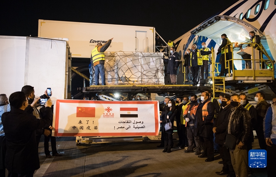 2021年2月23日凌晨,在埃及开罗国际机场,工作人员运输中国援助埃及的首批新冠疫苗。
