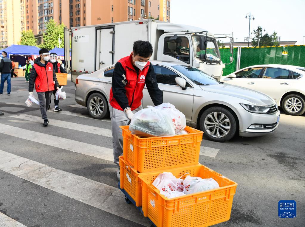 11月10日,在成都市成华区理工东苑西区,工作人员将蔬菜订单运送到封控小区门口。