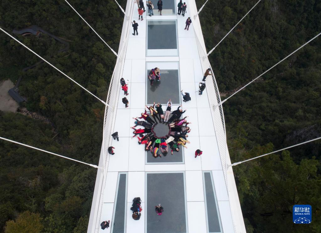 11月12日,游客在张家界大峡谷玻璃桥上游览(无人机照片)。